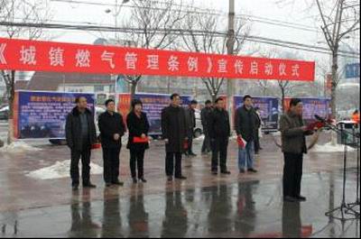 在永城公司,一場聲勢浩大的《城鎮燃氣管理條例》宣傳周啟動儀式在永城市人大副主任陳德志及建委主要領導的指導、見證下隆重舉行,永城公司員工及建委燃氣辦相關人員在盤鼓隊、宣傳車的配合下,克服雪后濕滑等困難,通過設立展板、發放宣傳材料等形式,沿繁華街區對《城鎮燃氣管理條例》進行了巡回宣傳。