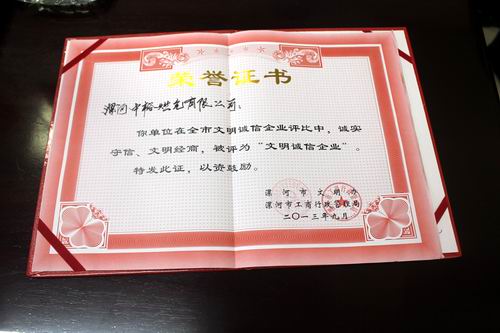“文明誠信企業”榮譽稱號的獲得,對漯河公司而言,既是認可和肯定,也是鞭策和鼓舞。多年來,漯河公司嚴格堅守職業道德、積極實踐規范管理、熱心參與公益事業,朝著“競爭實力強、社會信譽好、社會貢獻大”的目標不斷靠攏,在誠信經營、誠信發展方面做出了不懈的努力。今后,漯河公司將更加堅定的貫徹“文明誠信經營”的發展理念,為建設文明漯河和促進漯河經濟發展貢獻更多的力量。
